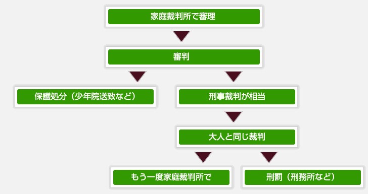 満20歳未満の人(手続上「少年」と呼びます)が事件を起こしたときは、家庭裁判所での審判を受けるのが原則です。審判では、処罰よりも、少年の健全な育成という視点にたって、専門家による教育プログラムが準備されている少年院への送致などを決定します。